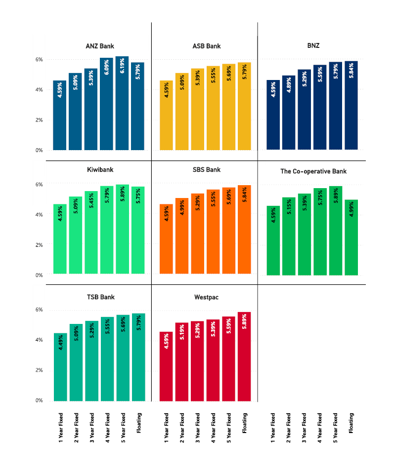 But there remains a wide disparity between what’s on offer. For example, regular fixed rates start at 4.49%, while long-term fixed mortgages top out at 6.29% and average floating rates sit in-between, at 5.76%.